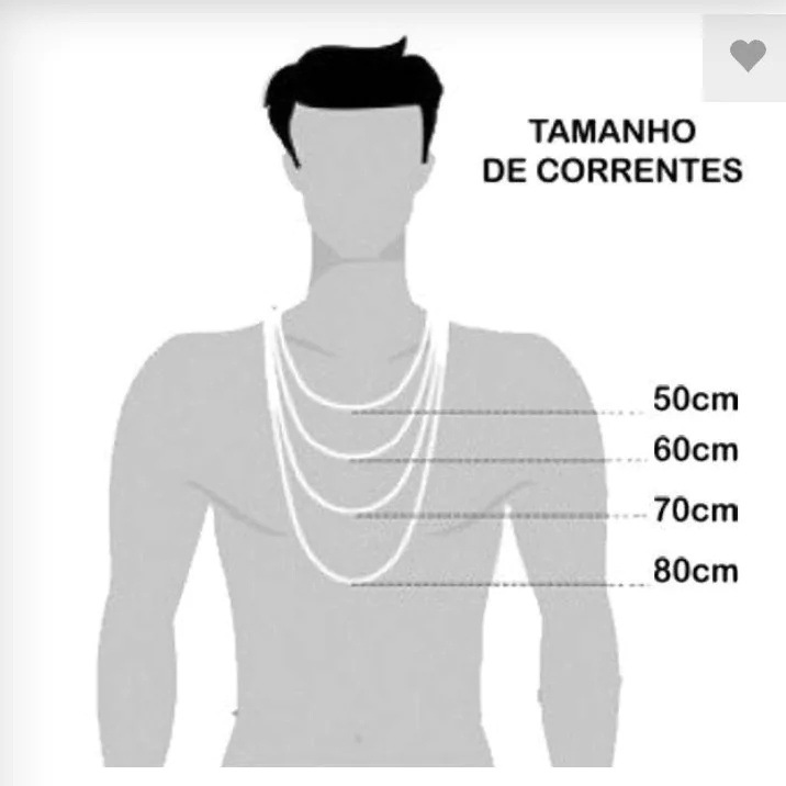 As CORRENTES possuem os tamanhos de 60cm e 70cm. Na última imagem deste produto, você conseguirá visualizar o tamanho e onde aproximadamente a peça ficaria em seu corpo.